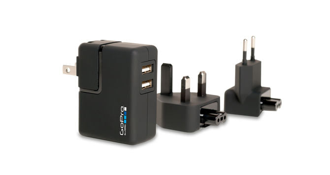 Charge two GoPro cameras simultaneously—anywhere in the world. The GoPro Wall Charger offers 2x faster charging of your GoPro batteries compared to charging with a USB cable and computer, plus you can charge and record simultaneously. Includes interchangeable AC plugs for US, UK, EU and AU style wall sockets.